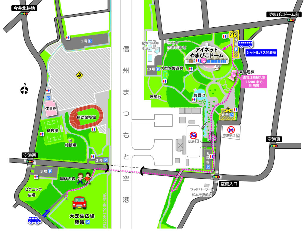 信州スカイパーク内の大芝生広場に臨時無料駐車場をご用意しておりますが、やまびこドームまで徒歩15~20分程度かかる駐車場のご案内になります。